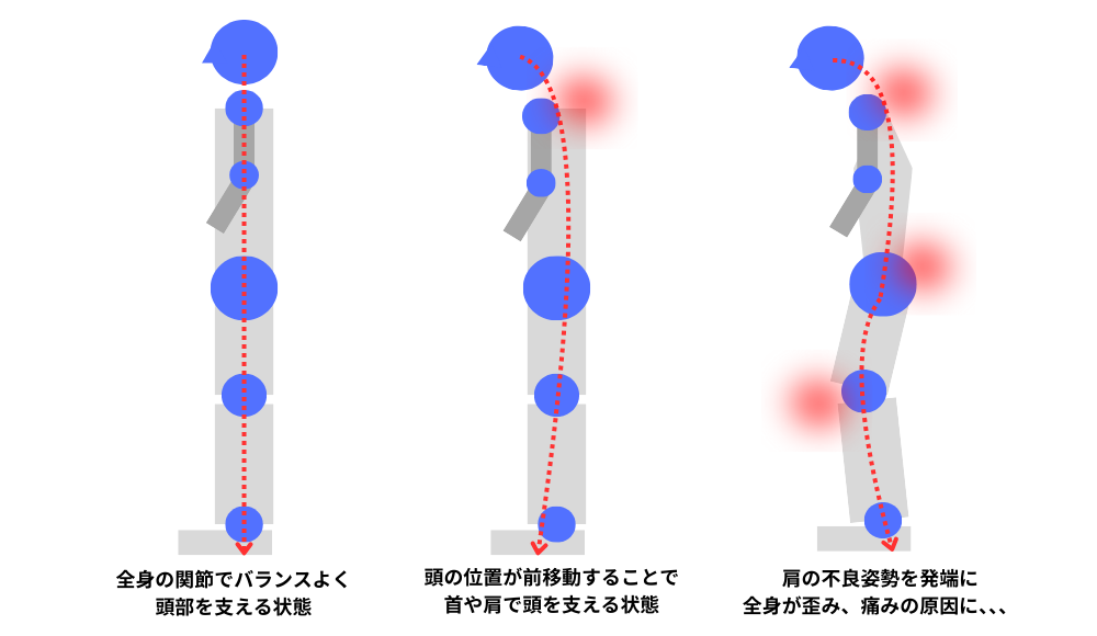 しかし、長時間のデスクワークやデジタル機器の使用によって頭が中心軸から外れることで、首や肩周りの筋肉が何とか頭を支えている状態です。(図中央)